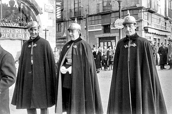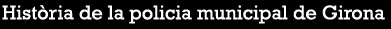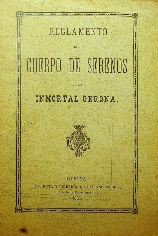 (Ampliar) - Policies municipals amb l'uniforme de gala. 1983. Jordi S. Carrera. CRDI - Ajuntament de Girona. Notes (1) - Va ser instituït segons un privilegi d'Alfons V el 31 d'octubre de 1430, amb l'objectiu d'evitar robatoris i violències al seu territori (R. Alberch, op. cit). Julián de Chía esmenta que "era más bien una asociación de socorros mutuos entre los individuos que la componían, que una fuerza verdaderamente protectora de los bienes y las personas en general". - Tornar al text(2) - Format per gent del país, va ser disolt per Felip V després de la Guerra de Successió i tornat a reinstaurar a partir de 1793 amb les primeres dificultats amb els revolucionaris francesos durant la Guerra Gran. - Tornar al text(3) - El càrrec de caporal va ser ocupat inicialment per Francesc Giner, que va durar pocs mesos, i va ser substituït per Nadrés Pereira (1857), Juan Vicente (1861), Joan Ferrés (1861 i 1867-1869) i Joan Carbó (1862-1866). Més tard varen ocupar el càrrec Francesc Canadell (1870 i 1885), Mateo Sendino (1884), Josep Sans (1890), i Julián Serrano (1895). Extret de "Policia Municipal", de Ramon Alberch. - Tornar al text(4) - Aquest ban va ser emès per la Comissió d'Enllumenat, de l'Ajuntament. Cal tenir en compte que una de les seves funcions primordials era anar pels carrers cantant les hores i el temps, de manera periòdica, i haver d'encendre els fanals d'oli a l'arribar el capvespre. Per aquest motiu, en el que cas que comentem, es va valorar molt la veu del candidat. Les hores i el temps s'havien d'anunciar en "idioma catalán, siguiendo la forma de costumbre", recordava l'Ajuntament al cap de serenos l'any 1918. Esmentat a "Policia Municipal", de Ramon Alberch. - Tornar al textBibliografia.
