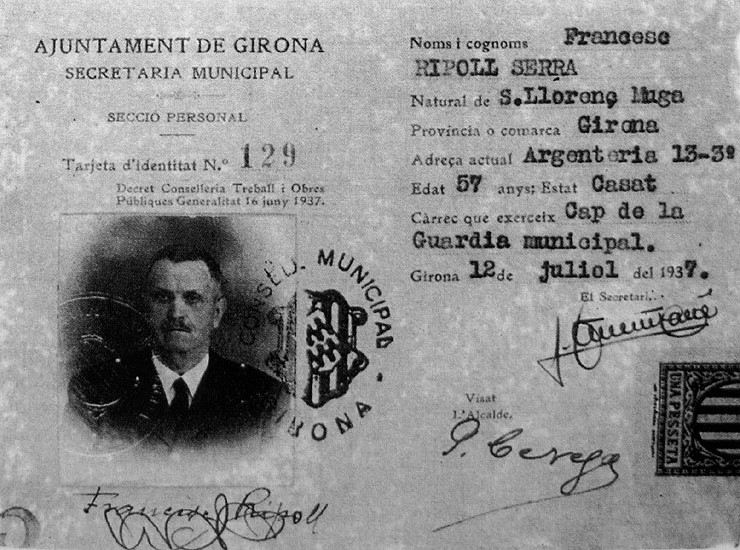 (Ampliar) - Targeta d'identitat de Francesc Ripoll, cap de la guàrdia nocturna. Juliol de 1937. Arxiu Municipal de Girona. Els serenos.
