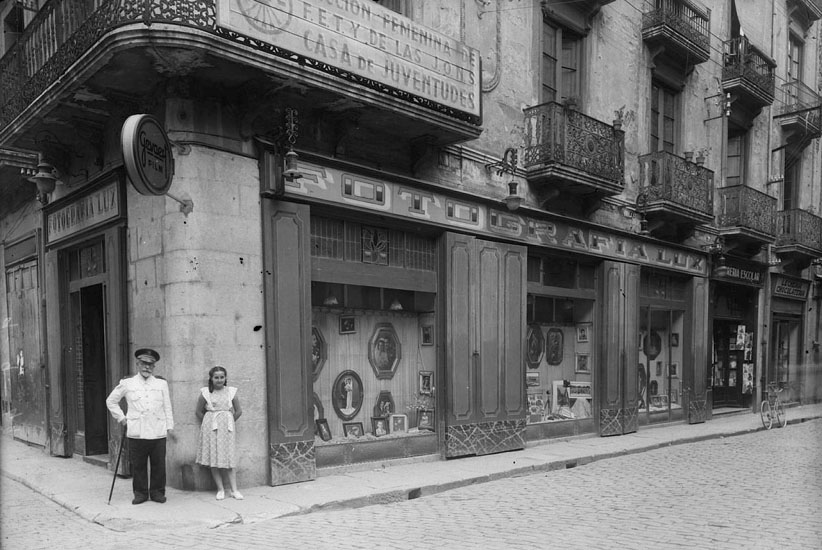 (Veure'l sencer) - Façana i aparador de la galeria Foto Lux en l'encreuament dels carrers Ciutadans i Cort Reial. S'observa el Cap de la Policia Municipal, el senyor Romero i a Joana Pereferrer. Sobre la galeria hi ha el local de la Secció Femenina de la Falange. 1950-1955. Foto Lux. CRDI - Ajuntament de Girona.