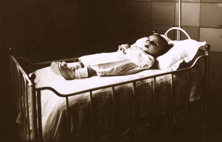 (Ampliar) - Retrat 'post mortem' d'un infant en un llit d'un hospital. 1932. Fotografia Unal. CRDI - Ajuntament de Girona.