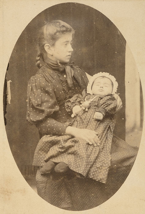 (Ampliar) - Retrat d'estudi del post mortem d'un nadó als braços d'una noia. 1890. Col·lecció Museu del Cinema - Tomàs Mallol, Girona.