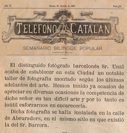 (Ampliar) - Notícia d'Amis Unal Alá, fundador de la nissaga, que va instal·lar el seu estudi al carrer Abeuradors. Publicat al diari "Teléfono Catalán" del 24/10/1880.