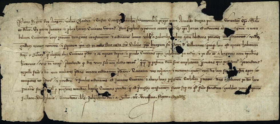 A la vida de les ciutats medievals la prostitució era una activitat normal legal, i fins i tot l'Església catòlica l'acceptava com a mal menor i considerava que era un vici impossible d'extirpar. No obstant, les prostitutes eren afectades per una sèrie d'ordinacions i regulacions, municipals i reials, entre altres la de ser obligades a recloure's a l'espai dedícat a bordell. ![]() (Ampliar) - 7 de gener de 1346. Àpoca atorgada per Guillem Cavaller, clergue de la seu, com a marmessor testamentari de Ramon de Trilles, difunt bracer de Girona, a favor de Guillem de [...], clergue de Santa Eulàlia Sacosta de Girona. Fons Ajuntament de Girona.