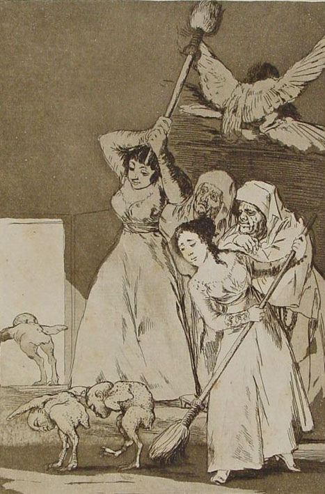 (Ampliar) - Gravat de la sèrie 'Los Caprichos' de Goya. 'Y van desplumados', segons el manuscrit de la Biblioteca Nacional, representa: "Después de la cópula de los avechuchos, las putas los arrojan a escobazos, desplumados, cojos y cabizbajos: dos frailes muy reverendos los guardan las espaldas, y son los que celebran la burla con sendos rosarios a la cintura". Viquipèdia.