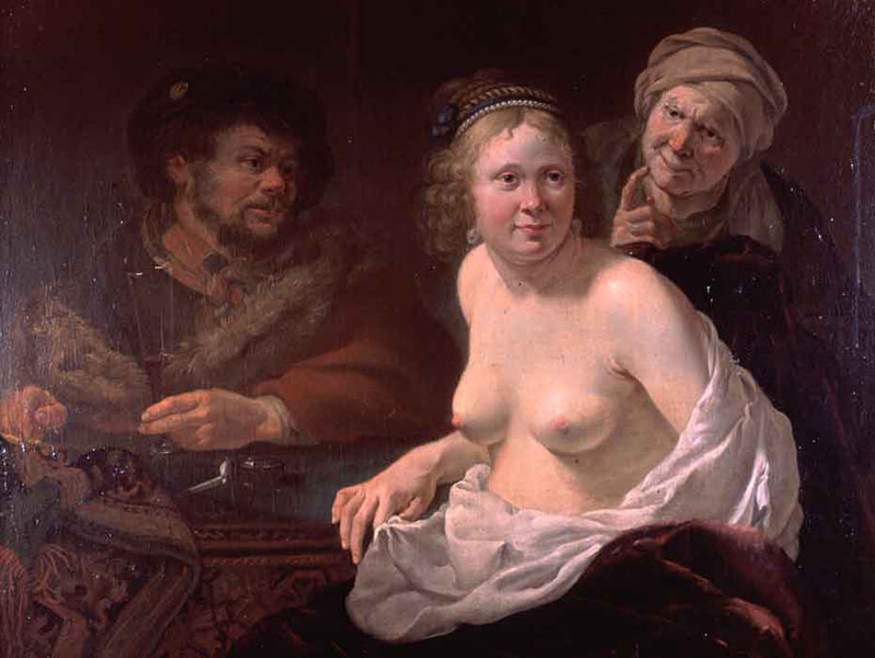 En un document del 1393 els jurats de la ciutat expliquen que, entre el portal de Sobreportes i la torre Cornèlia, al costat del mur vell, hi havia un pati en el qual "fiunt de nocte ef commituntur plura maleficia com vilis mulieribus et alia". Generalment, però, els centres de prostitució en la Catalunya del segle XIV eren els hostals, freqüentats per la gent de pas i els marginats. ![]() (Ampliar) - Els alcavots. Pintura de Jan G. van Bronckhorst, 1636–1638. Viquipèdia. La prostitució fora dels bordells.