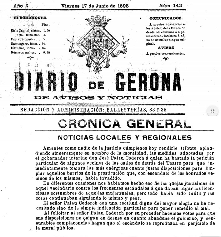 (Ampliar) - Premsa. Tancament dels bordells de les 'calles de detrás del Teatro'. Diario de Gerona, 17 de juny de 1898. Fons Ajuntament de Girona.