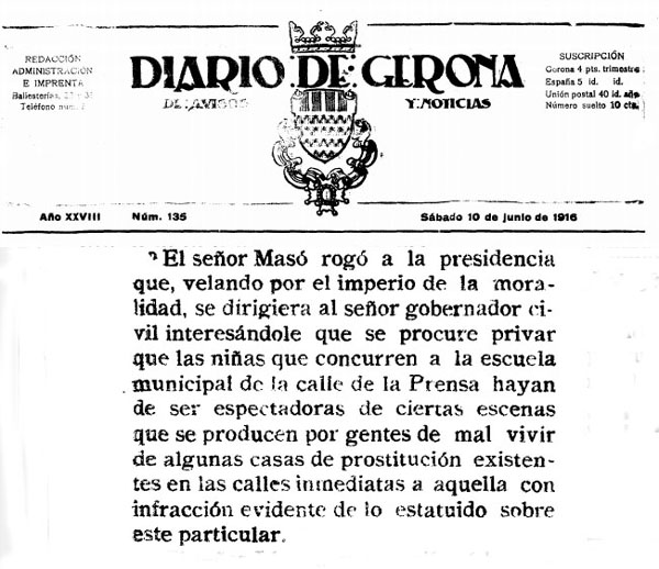 (Ampliar) - Premsa. Bordell al carrer de la Premsa, al barri del Mercadal. Diario de Gerona, 10 de juny de 1916. Fons Ajuntament de Girona.