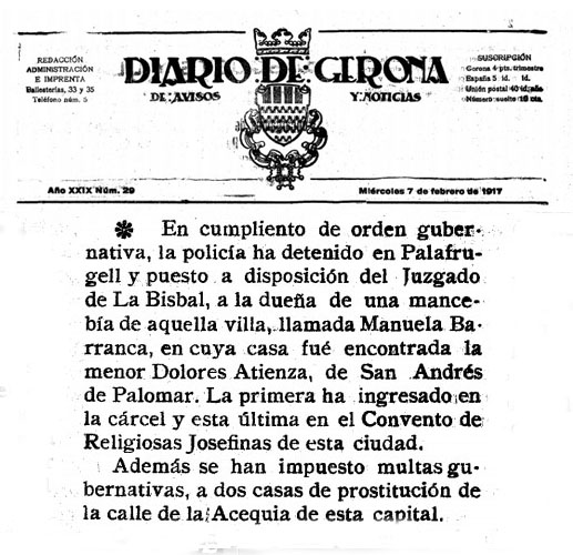 (Ampliar) - Premsa. Bordell al carrer de la Sèquia, al barri del Mercadal. Diario de Gerona, 7 de febrer de 1917. Fons Ajuntament de Girona.