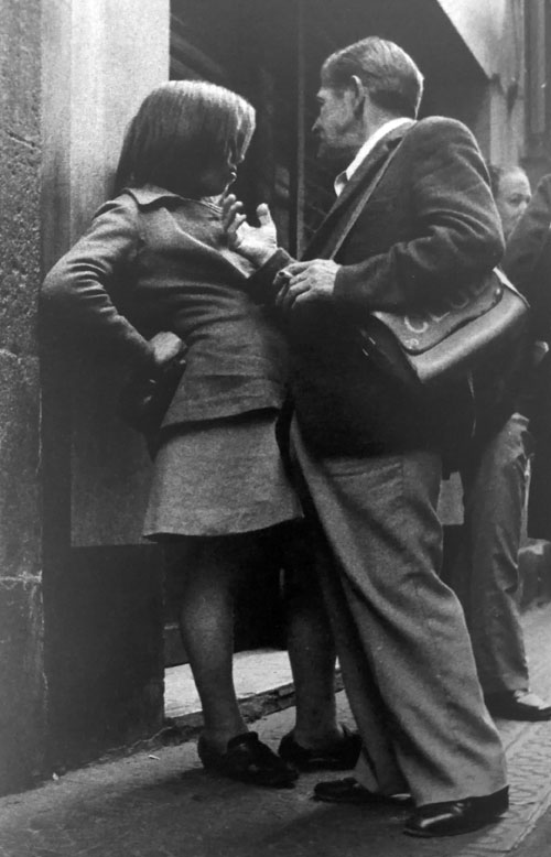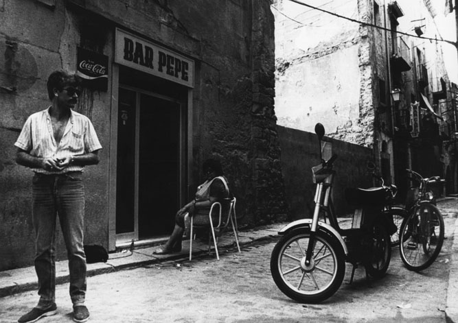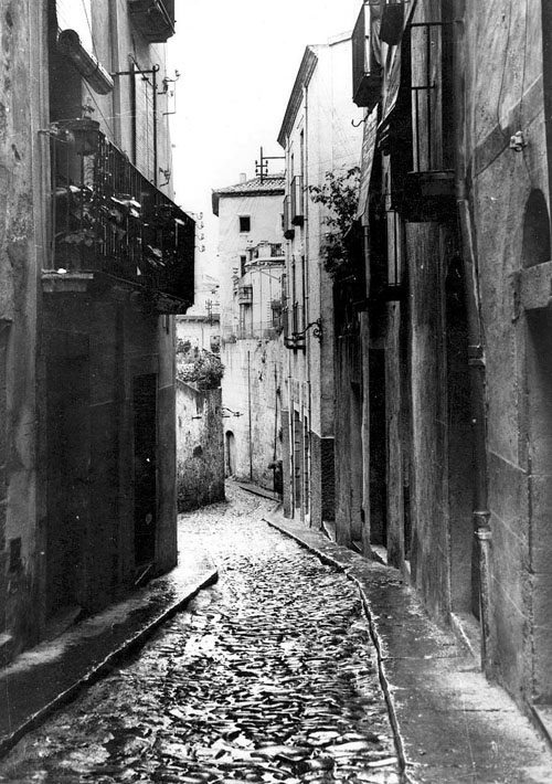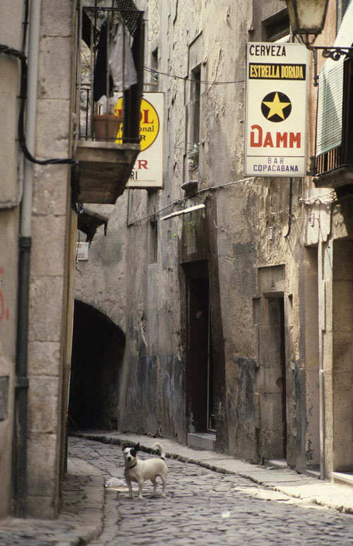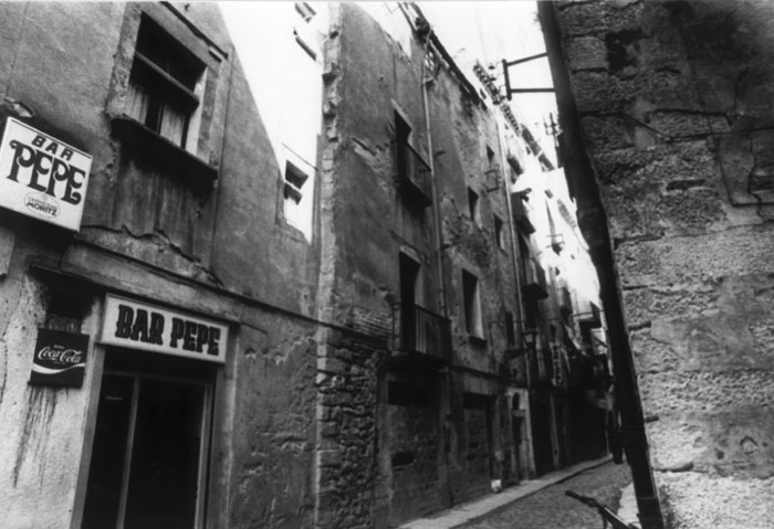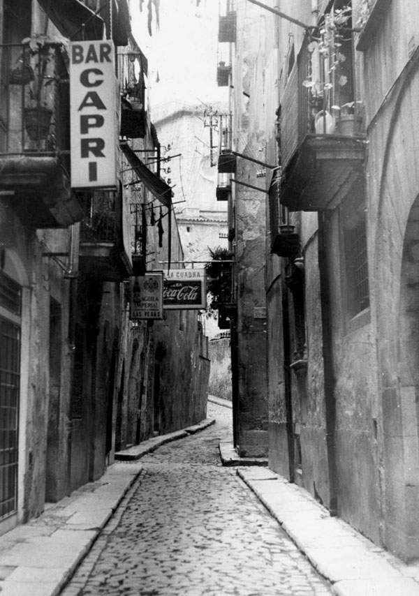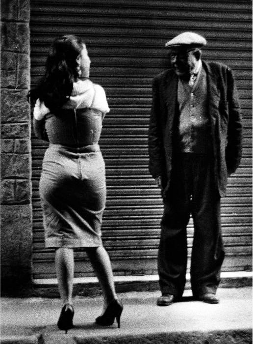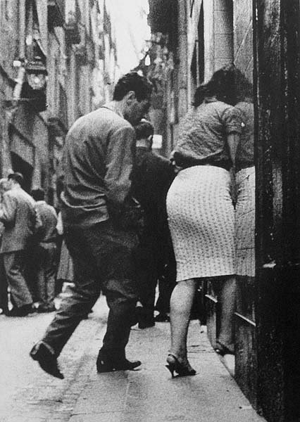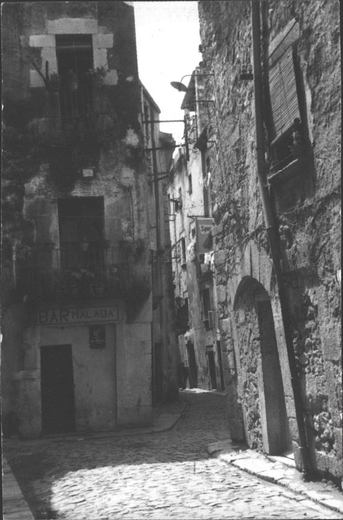 les lliures, que viuen al domicili, i la prostituta pupil·la, que viu en “cases de tolerància” o “lenocini”, i reglamentaven que les cases de prostitució havien d'estar allunyades d'edificis públics, com escoles o esglésies, alhora que havien de tenir vidres opacs o cortines que impedissin veure l'interior. Les prostitutes havien de disposar d'una cartilla d'inscripció, en la qual constessin la fotografia, la filiació i el número de registre, cartilla on s'anotaven les revisions mèdiques periòdiques a què eren sotmeses. Les contravencions del reglament i “l'escàndol prostitucional a la via pública” eren castigats amb multes o empresonaments. ![]() (Ampliar) - Carrer de la Barca. 1979-1982. Josep Montenegro. CRDI - Ajuntament de Girona. La Guerra Civil i l'abolicionisme de 1956..