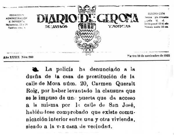 (Ampliar) - Premsa. Bordell al carrer d'en Mora. Diario de Gerona, 10 de novembre de 1925. Fons Ajuntament de Girona.