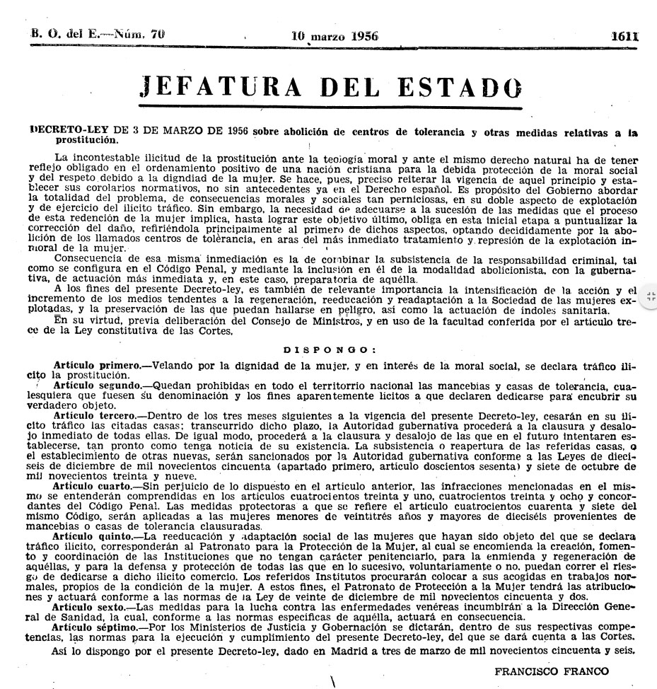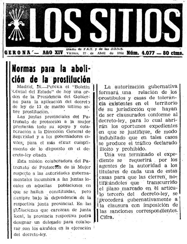 Amb la Guerra Civil la prostitució a Girona es va incrementar per diversos motius, com la concentració de tropes, l'existància de grans bosses de misèria o l'increment de dones soles desemparades que s'havien de guanyar la vida com fós. ![]() (Veure'l sencer) - Decreto-ley de 3 de marzo de 1956 sobre abolición de centros de tolerancia y otras medidas relativas a la prostitución. Publicat el 10 de març de 1956. Font. BOE.