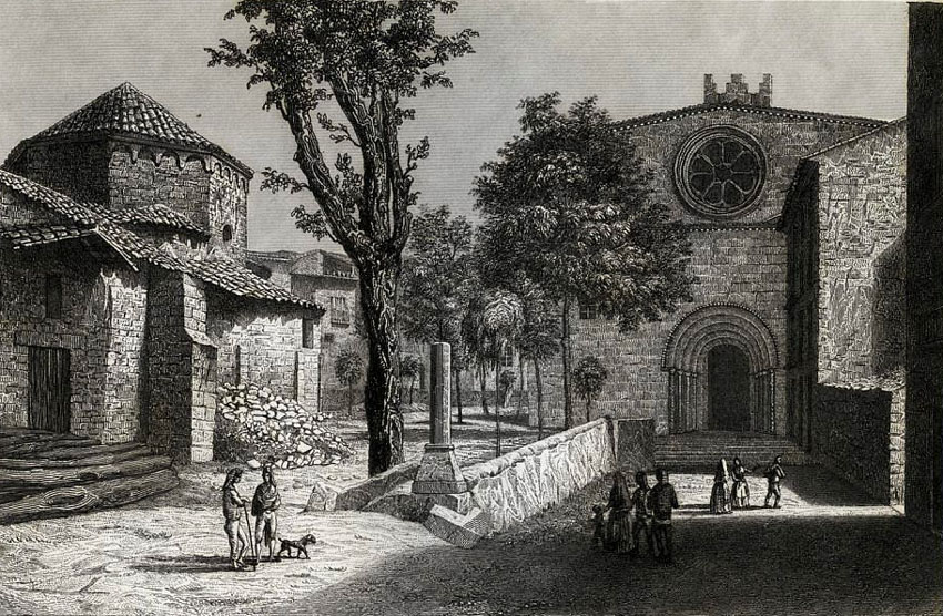 Sant Pere havien escollit un lloc apartat perquè s'hi concentressin les prostitutes de Girona. ![]() (Veure'l sencer) - Vista del monestir de Sant Pere de Galligants i l'església de Sant Nicolau. 1842. Antoni Roca Sallent, gravador. CRDI - Ajuntament de Girona.