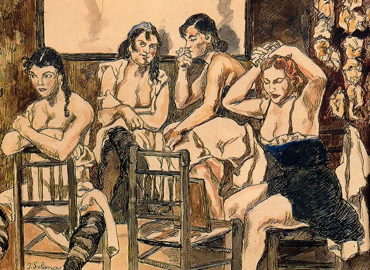 Des de finals del segle XVI fins les primeres Reglamentacions del segle XIX la prostitució va ser tolerada o perseguida en funció de les èpoques i els governs, en base a l'alternança en el poder polític dels partidaris d'una reglamentació pretesament adient i eficaç, que fós capaç de controlar la terrible sífilis, i d'altres partidaris de la més rigorosa prohibició. L'auge de la qüestió religiosa a Espanya a partir de la Contrareforma, que va començar amb el Concili de Trento (1545-1563) i acabà amb el final de la Guerra dels Trenta Anys (1648), va propiciar que es dictessin diverses pragmàtiques mitjançant les quals es provava d'abolir la prostitució, amb la superssió dels bordells. El 1623 Felipe IV ordenava que "en adelante, en ninguna ciudad, villa ni aldea de nuestros reinos, se pueda tolerar, y que en efecto, no se tolere, lugar alguno de desorden, ninguna casa pública donde las mujeres trafiquen con sus cuerpos". ![]() (Ampliar) - Escena de burdel. Cuatro mujeres. José Gutierrez Solana. Viquipèdia.