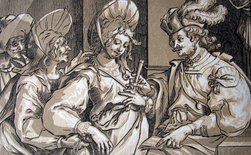 "expellesqua de dit loch públic totes les dones qui sien malaltes del dit mal, e açò fossa e exerquescha en virtut del sagrament e homenatge que prestat ha de exerquir e complir totes ordinacions de jurats". ![]() (Ampliar) - L'alcavota. Ludolph Büsinck, 1623-1630. Viquipèdia. Alcavots i alcavotes.