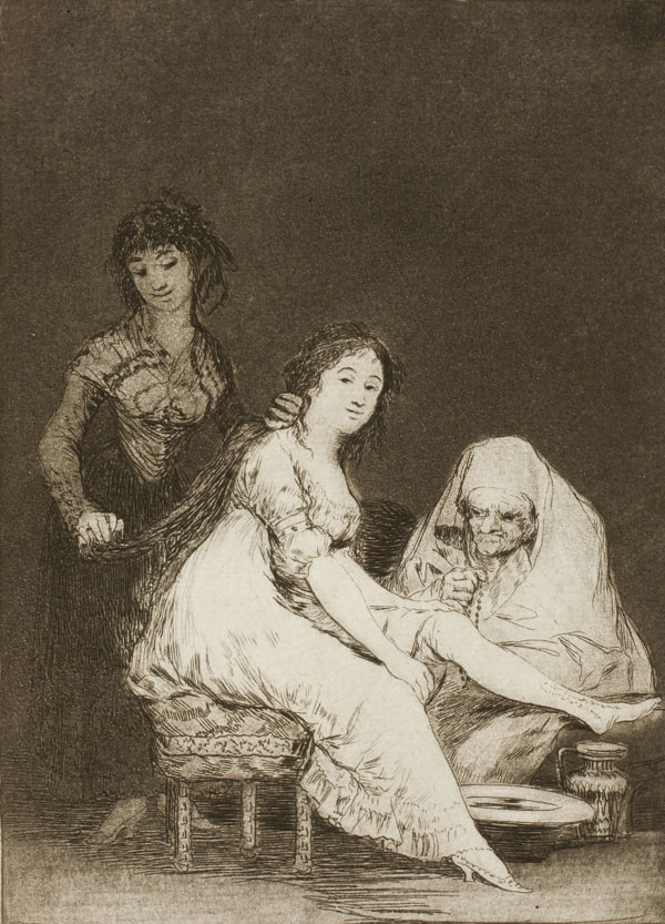 (Ampliar) - Gravat de la sèrie 'Los Caprichos' de Goya. 'Ruega por ella' representa una prostituta i la seva alcavota. 1799. Viquipèdia.