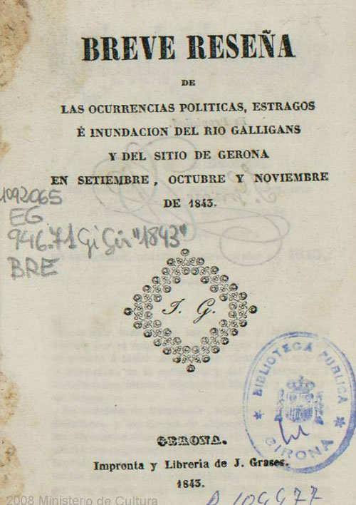 - "Breve reseña de las ocurrencias políticas, estragos é inundacion del rio Galligans y del sitio de Gerona en setiembre, octubre y noviembre de 1843". J. Grases. 1843. Imprenta y Libreria de J. Grases. Girona.