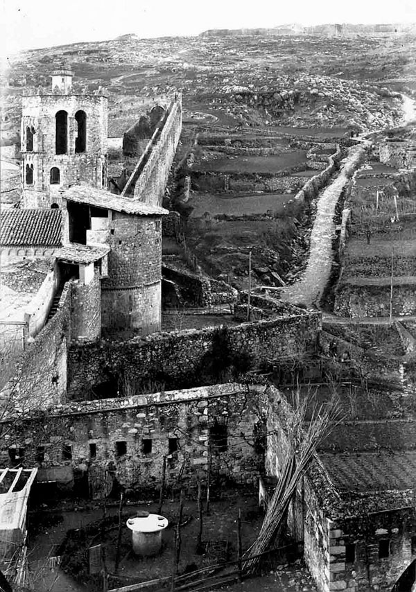 (Ampliar) - El monestir de Sant Pere de Galligants i el tram de muralla que enfila cap a la muntanya de Montjuïc. En primer terme, les restes del baluard de Sarraïnes, i al centre, el Tambor de Sant Daniel, que protegia el portal. 1910-1920. Autor desconegut. CRDI - Ajuntament de Girona.