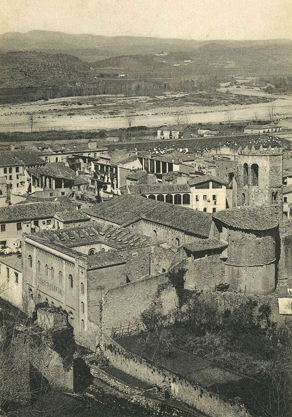 - Vista del monestir de Sant Pere de Galligants i del tram de muralla que enfila cap a Montjuïc. En primer terme, el llit del riu Galligants. Al centre, adossat a la muralla, el tambor de Sant Daniel i el portal de Sant Pere. 1896-1911. Autor desconegut. CRDI - Ajuntament de Girona.