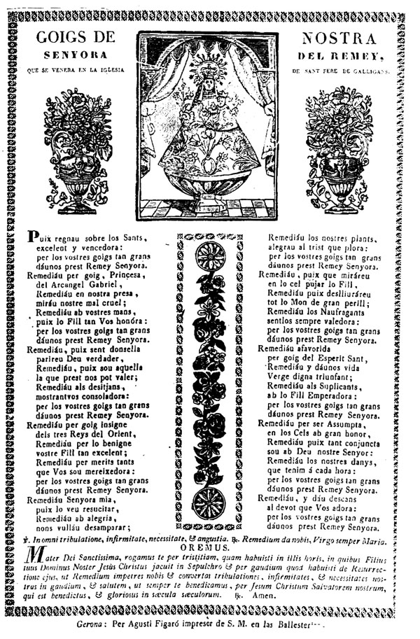 (Ampliar) - Goigs a la Mare de Déu del Remei, venerada a l'església de Sant Pere de Galligants. Impremta d'Agustí Figaró, primera meitat del segle XIX.