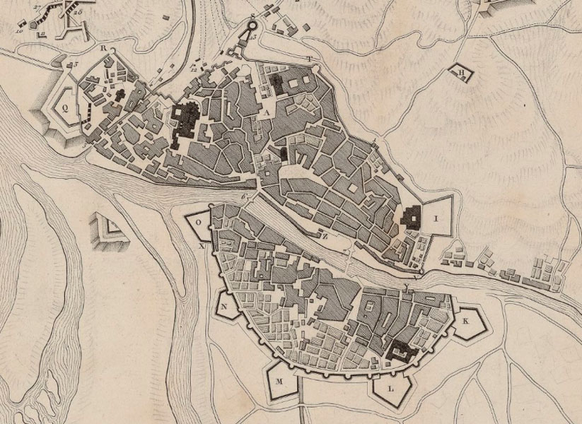 (Ampliar) - Plan du Siège de Gironne. Par l'Armée de sa Majesté en Catalogne en 1809. Detall. Bibliothèque nationale de France. Amb la lletra T s'indica la torre de Sant Domènec o de Predicadors.