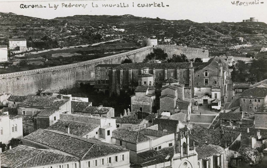 (Ampliar) - Vista panoràmica de la ciutat de Girona des de la muntanya de les Pedreres. En primer terme, el tram de la muralla de les Pedreres comprés entre la torre del General Peralta i la torre del Peix. En segon terme, el barri Vell on destaca el Seminari Diocesà i el convent de Sant Domènec al centre. Al fons sobresurten el campanar de l’església de Sant Feliu i la Catedral de Girona. 1905-1909. Àngel Toldrà Viazo. CRDI - Ajuntament de Girona.