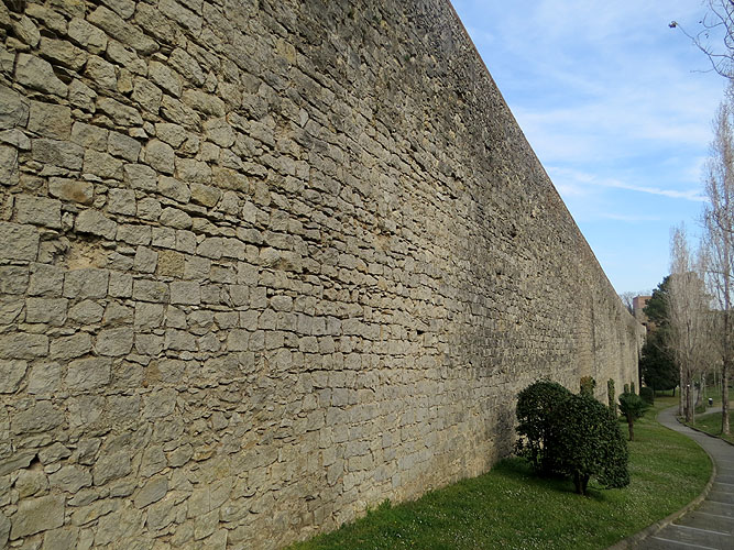 Vista exterior de la muralla de Pere el Cerimoniós (segle XIV). Al fons, la torre de Sant Domènec