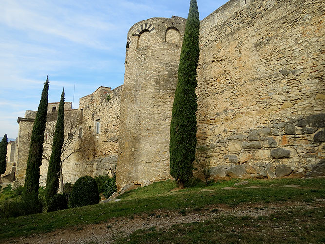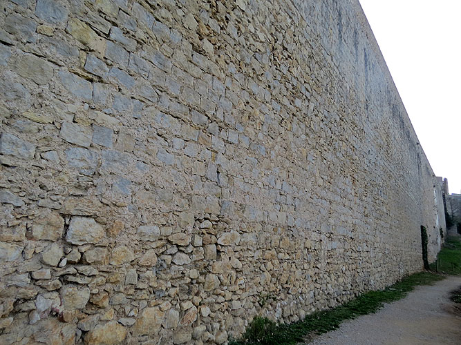 Vista exterior de la muralla de Pere el Cerimoniós (segle XIV). Al fons, la torre del Llamp