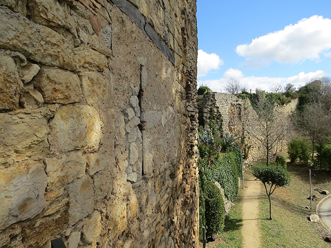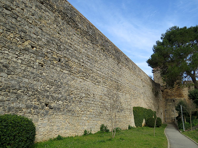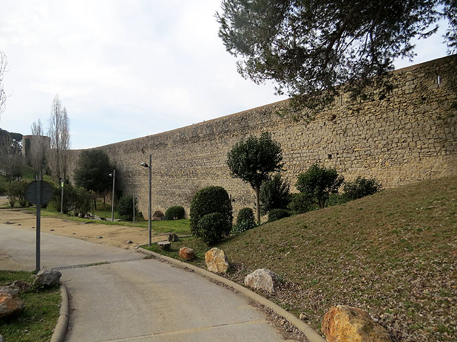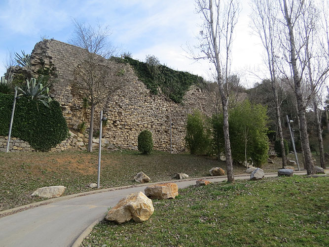 Vista exterior de la muralla de Pere el Cerimoniós (segle XIV). Al fons, la Torre Gironella