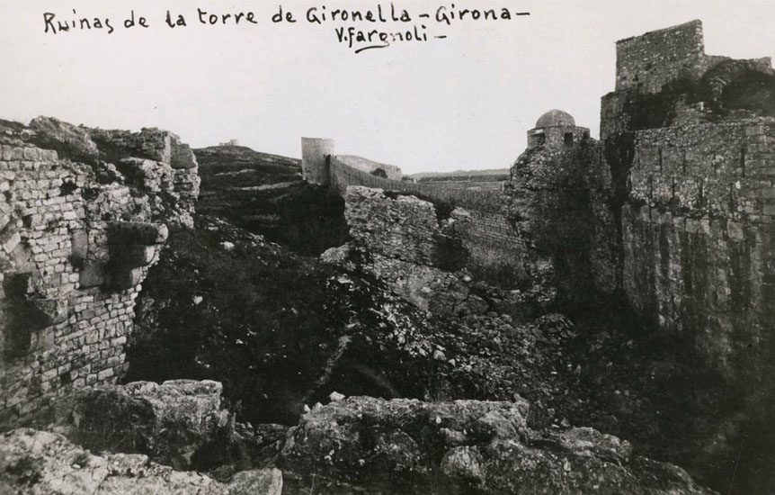 (Ampliar) - La muralla de Sant Domènec entre la torre del mateix nom, també dels Predicadors o del Peix, i la torre del Llamp, anomenada del Sastre o del Telègraf. 1902-1925. Valentí Fargnoli. CRDI - Ajuntament de Girona.