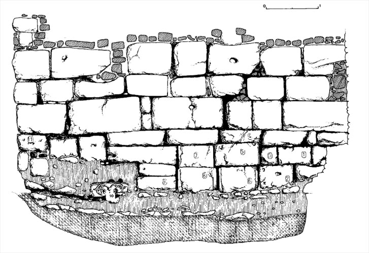 (2) - Consisteix en sis filades de carreuat de gran formant, amb molts blocs procedents d'edificis amortitzats, tres de paret vista i tres de fonamentació, i més en sota, una massa de caementicium que fa de solera en contacte amb la roca natural.