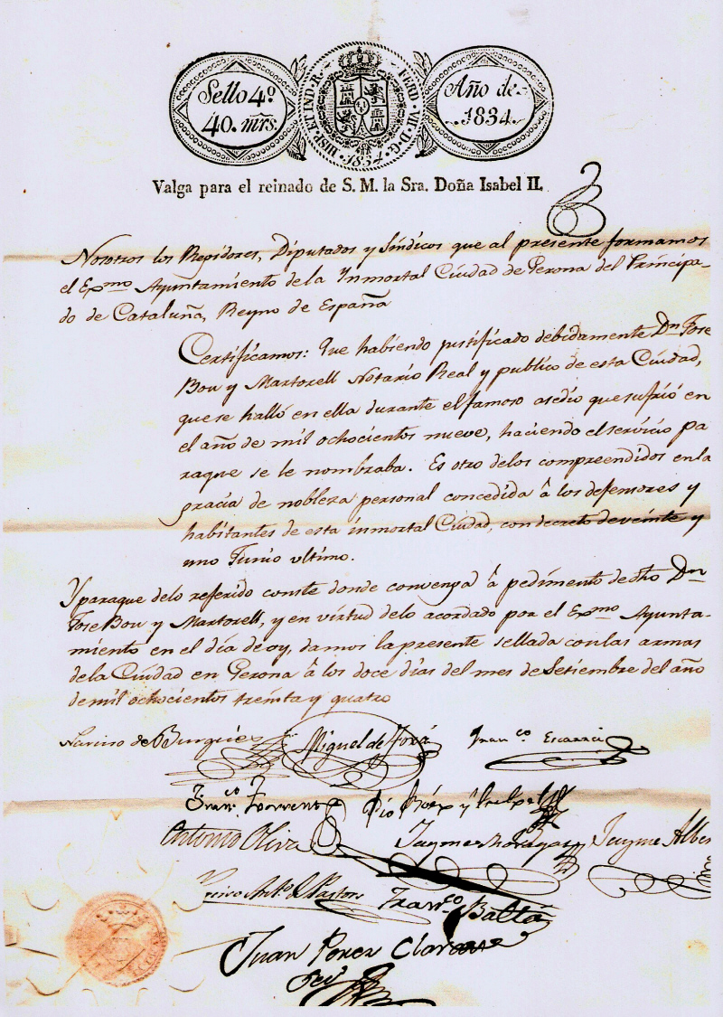Y paraque delo referido conste donde convenga á pedimento de dho Dn Jose Bou y Martorell, y en virtud delo acordado por el Exmo Ayuntamiento en el dia de oy, damos la presente sellada conlas armas de la Ciudad en Gerona á los doce dias del mes de Setiembre del año de mil ochocientos treinta y quatro
