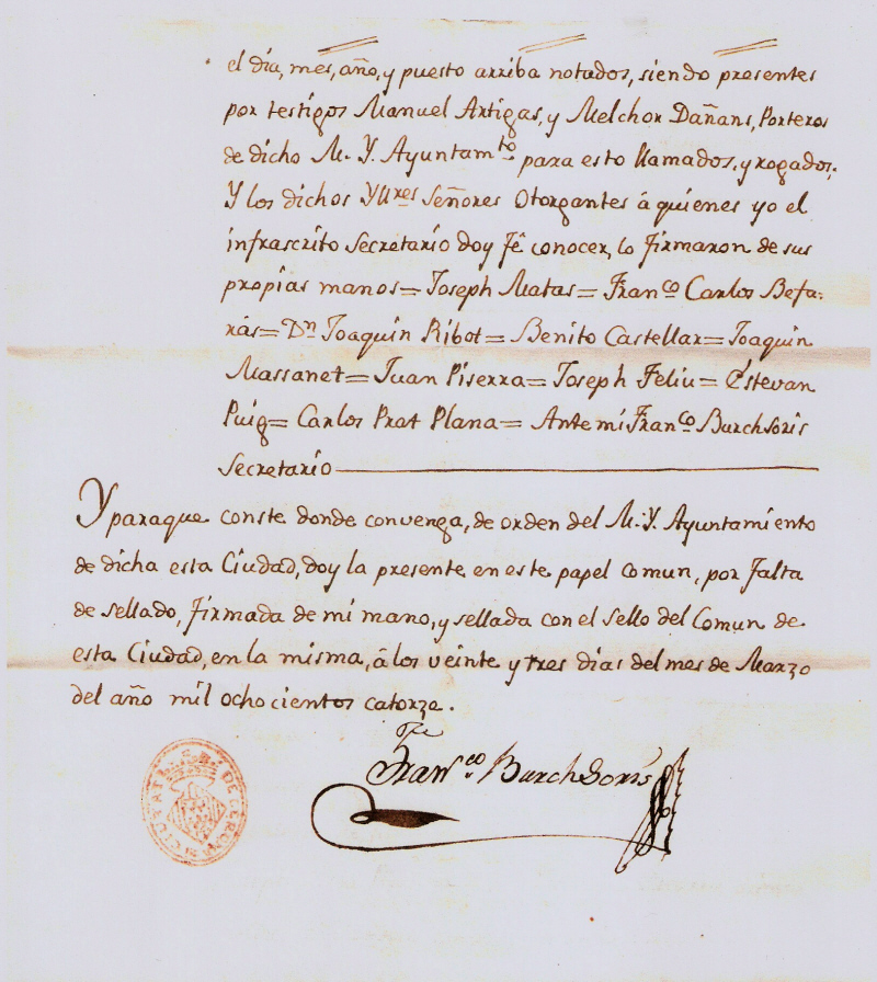 Sepase por esta publica Escritura, como en la Ciudad de Gerona á los veinte y dos dias del mes de Marzo del año de mil ochocientos catorze: Ante mí Dn Franco Burch Sorís Secretario del M.Y Ayuntamiento Provisional Constitucional de dicha Ciudad baxo escrito, y de los infrascritos testigos; Los Muy Yltres Señores Dn Joseph Matas Alcalde segundo, Dn Franco Carlos Befarás, Dn Joaquin Ribot, Dn Benito Castellar, Dn Joaquin Massanet, Dn Juan Piserra, Dn Joseph Feliu, Dn Estevan Puig Regidores, y Dn Carlos Prat Plana Sindico segundo, junto con los abaxo nombrados Dn Joseph Bou Regidor y Dn Francisco Escarrá primer Sindico, hallandose convocados en la Pieza Capitular de las Casas del Comun de la misma Ciudad en Ayuntamiento presidido por dicho Muy Iltre Señor Alcalde segundo: Dixeron, Que no habiendo cosa mas justa, que manifestar á todo momento, el amor, y veneracion, y respeto que se debe á los Soberanos, y debiendo llegar S.M. el Señor Dn Fernando septimo, con los Serenisimos Señores Ynfantes, á la Villa de Bascara, debia esta leal , y noble Ciudad de Gerona, por medio de Diputados Comisionados pasar á aquella Villa, para poder á su debido tiempo cumplimentar á Su Magd Y Altesas, dandoles la bienvenida, y enhorabuena por su Feliz llegada á este su Reyno, y verse libre del cautiverio que ha sufrido hasta ahora, y que por lo tanto, debian de dar, y otorgar, como de su espontanea voluntad, y cierta siencia, insiguiendo lo resuelto por dicho Muy Iltre Ayuntamiento, con su acuerdo del dia de hoy, dieron, y otorgaron todo su poder cumplido, y bastante qual de derecho se requiere, y es necesario, á los Nobles Señores Dn Joseph Bou Regidor, y Dn Franco Escarrá primer Síndico, á este auto presentes, para que en nombre de esta dicha Ciudad de Gerona, pasen á la Villa de Bascara á presentarse ante S.M. y Altesas, y demas Reales personas que acaso se encuentren en ella, en nombre de esta muy noble y leal Ciudad, les besen las Reales manos, dandoles al propio tiempo la bienvenida, y le manifiesten el juvilo que ha causado á todos estos sus leales Vasallos su regreso á este Reyno, y que haya salido del cautiverio que hasta ahora ha sufrido, con todo lo demas que miren por conveniente: En cuio testimonio así lo otorgaron los dichos Muy Iltres Señores Alcalde segundo, Regidores y Síndico, en el dia, mes, año, y puesto arriba notados, siendo presentes por testigos Manuel Artigas y Melchor Dañans, Porteros de dicho M.Y. Ayuntamto para esto llamados, y rogados. Y los dichos Yltres Señores Otorgantes á quienes yo el infrascrito Secretario doy fé conocer lo firmaron de sus propias manos = Joseph Matas = Franco Carlos Befarás = Dn Joaquin Ribot = Benito Castellar = Joaquin Massanet = Juan Piserra = Joseph Feliu = Estevan Puig = Carlos Prat Plana = Ante mi Franco Burch Sorís Secretario.
