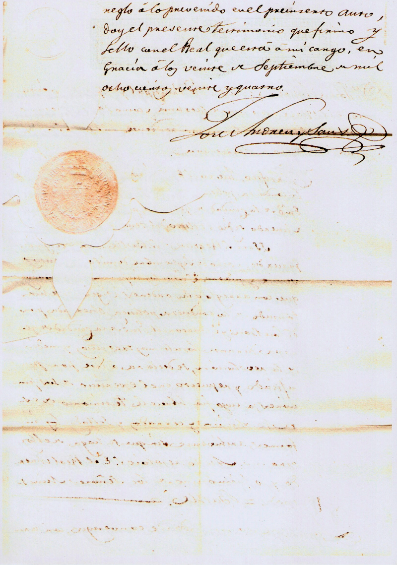 Y para que conste donde convenga, con arreglo á lo prevenido en el presente auto, doy el presente testimonio que firmo y sello con el Real que está á mi cargo, en Gracia á los veinte de Septiembre de mil ochocientos veinte y quatro