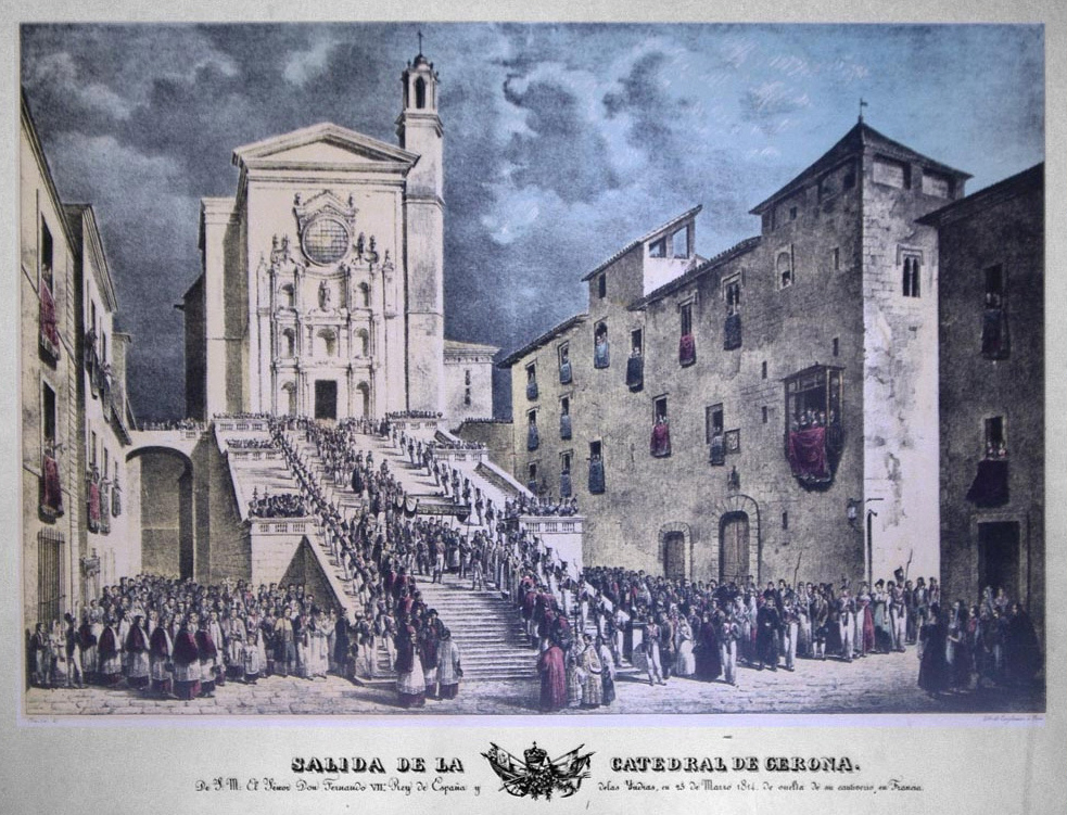 - Salida de la Catedral de Gerona. De S. M. El Señor Don Fernando VIIº, Rey de España y de las Indias, en 25 de Marzo de 1814. De vuelta de su cautiverio en Francia. Gravat de Bonaventura Planella Conxello (1772 - 1844) i Charles-Caius Renoux (1795 - 1846). Reproducció facsímil d'edicions Dalmau Carles Pla, acolorida per Joaquim Pla i Dalmau. Col·lecció particular, Girona.
