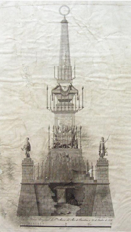 (Ampliar) - Pompa fúnebre de Barcelona dedicada a Álvarez de Castro. Gravat de Francesc Renart i Closas, i Domènec Estruc (o Estruch). 1816. Procedència: Relación que en la pompa fúnebre que en virtud de Real Orden de S. M. se ha efectuado en esta capital, á los restos del Excmo. Sr. D. Mariano Alvarez de Castro. Oficina de Garriga y Aguasvivas. Barcelona. 1816. Arxiu Municipal de Girona.