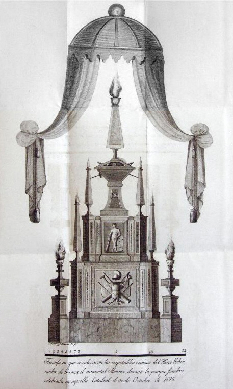(Ampliar) - Túmulo en que se colocaron las respetables cenizas del Heroe Gobernador de Gerona, el inmortal Alvarez, durante la pompa fúnebre celebrada en aquella Catedral el 30 de Octubre de 1816. Gravat de Josep Barnoya i Domènec Estruc (o Estruch), 1816. Arxiu Municipal de Girona.