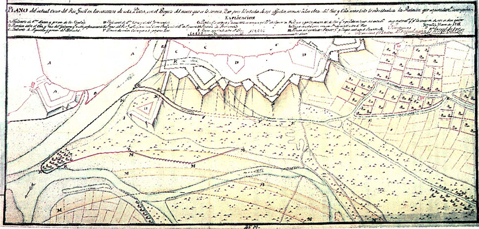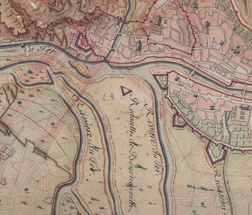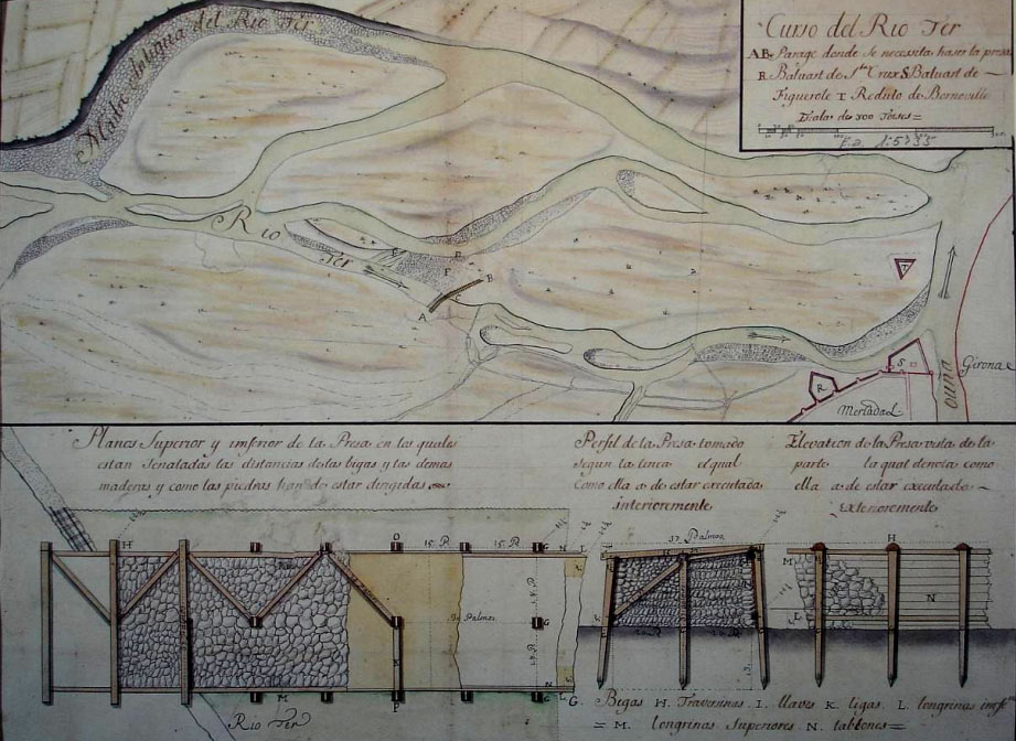 La situació de la lluneta de Bournonville prop de la confluència dels rius Ter i Onyar feia que quedés afectada per les crescudes periòdics dels dos rius, als que sovint s'afegia el Güell. Fins i tot en un plànol francès de 1694, la lluneta està representada en una illa. La primera de les obres hidràuliques d'importància que es realitzaren al Ter durant el regnat de Felip V va ser la construcció d'una presa al braç que uneix el Ter amb el Güell, amb l'objectiu de protegir els baluards de Figuerola, Santa Creu i la lluneta de Bournonville. La presa, però, va perdre aviat la funció per la que havia estat dissenyada després de les modificacions que noves i successives riuades van anar produint als braços del Ter. ![]() (Ampliar) - Projecte de desviament del Güell i construcció de dics a la confluència del Güell, l'Onyar i el Galligants amb el riu Ter, per l'enginyer José Fabre. 25 de gener de 1741. Servicio Geográfico del Ejército, Madrid.