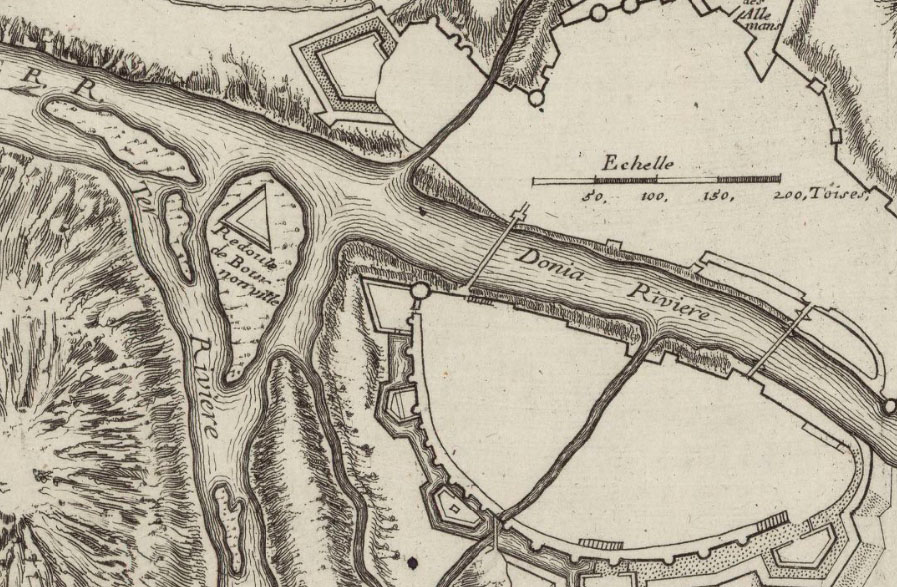 La lluneta va ser construïda el 1678 i se li donà aquest nom en honor a Alexandre de Bournonville, lloctinent de Felip IV a Catalunya. Actualment no en queda cap resta. ![]() (Ampliar) - Lluneta de Bournonville. Construcció defensiva de finals del XVII. En aquest espai és on es construiria el mercat del bestiar de la Devesa. 1900-1930. Josep Jou Parés. CRDI - Ajuntament de Girona. ![]() (Ampliar) - Plànol del curs del riu Ter elaborat el 20 de gener de 1714. Dissenyat per José i Theodoro de Bauffé per projectar les preses i dics de contenció al Ter. Marcat amb la lletra T s'hi observa la lluneta de Bournonville. Archivo de Planos del Servicio Cartográfico del Ejército. Madrid. Una defensa inundable.