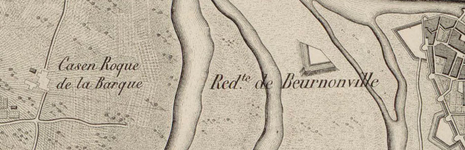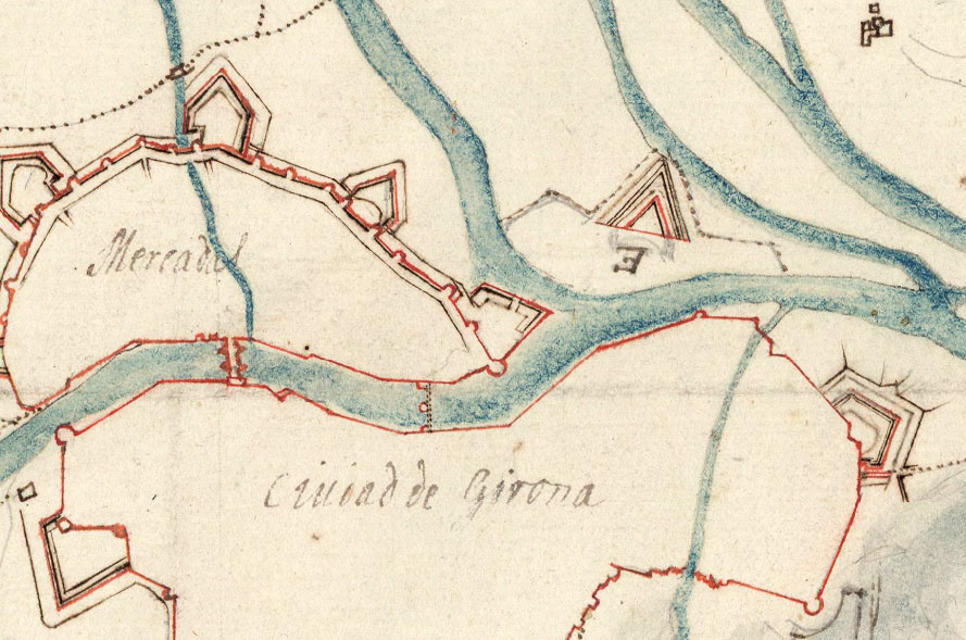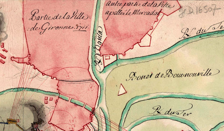 L'enginyer francès Nicolás D'Arcourt, arran de la seva estada a Girona, va informar de la necessitat de fer noves obres de defensa de la lluneta de Bournonville, projecte que seria recollit i elaborat uns anys després per l'enginyer Esteban Panon, que proposava dues solucions: reforçar el dic de Bournonville o bé construir una nova presa en el braç del Ter que amenaçava la fortificació. ![]() (Ampliar) - Detall de 'Girone, ville forte d'Espagne, de la province de Catalogne. Elle fut prise par l'Armée du roy dans la campagne de 1694 '. 1694. Bibliothèque nationale de France. La lluneta de Bournonville hi està aïllada. Les obres realitzades per l'enginyer José Fabre el 1741 no varen ser suficients per evitar que desapareixessin totalment amb l'avinguda del desembre de 1742. A partir del maig de 1743 una sèrie de projectes tenien per objectiu separar les aigües del Güell i l'Onyar de les del Ter i evitar, així, el seu embassament. Es varen estudiar projectes que contemplaven el desviament de l'Onyar (Ca. 1750), rectificació del curs del Ter (1763, 1802). (Dades extretes de "Natura, societat i calamitat. Una aproximació a les inundacions històriques de la ciutat de Girona", tesi doctoral d'Anna Ribas Palom, UAB 1994). ![]() (Ampliar) - Detall de 'Plan de l'enceinte fortifiée de Gironne'. 1710. Bibliothèque nationale de France. La lluneta de Bournonville hi és indicada amb la lletra E. Notes històriques sobre la lluneta. Al "Diccionario geográfico-estadístico-histórico de España y sus posesiones de ultramar" (Pascual Madoz, 1845) es descriu la lluneta de Bournonville: "De las muchas obras esteriores y destacadas que hay dependientes de Gerona, solo está en llano el reducto de Bournonville. Consiste en un rebellin sin flancos, con foso y camino cubierto, colocado en un llano que se forma entre los rios Ter, Oña y Guells á unas 170 varas del recinto por la parte que mira al rio y poco mas del baluarte de la Figuerola. ![]() (Ampliar) - Detall de 'Plan des Attaques et Partie de la Ville de Gironne, 1711'. 1711. Bibliothèque nationale de France. Las caras de este reducto baten la campiña que se aproxima á los baluartes del Mercadal, Sta. Cruz y el Gobernador, la union de los rios Oña y Ter, las costas de este y el Guells y parte del camino de Francia. Su ataque es difícil por tener que hacerle al descubierto pasando el Ter y por los muchos fuegos de flanco que pueden defenderle desde la c. (ciutat) y Mercadal. Al mismo tiempo cubre, aunque imperfectamente, el recinto aut. de la c. que no lo esta por el Mercadal en la parte que la baña el Oña; pero para ser socorrido hay que pasar uno de los rios menores". ![]() (Ampliar) - Detall de 'Plan des attaques de Gironne, depuis le 22 décembre que la tranchée a esté ouverte jusqu'au 23 janvier 1711 que la place s'est rendu'. 1711. Bibliothèque nationale de France. El 14 de març de 1908, el diari ABC publicava el projecte de llei que es presentaria a les Corts per part de la comisió gestora de l'enderrocament de les muralles de Girona, on deia "Art. 3º. Serán cedidos igualmente al Ayuntamiento de Gerona la luneta de Bournonville, los Baluartes del Gobernador, Santa Clara, San Francisco y el cuartel del mismo nombre, construyendo, previamente, en cambio, aquella Corporación, de su cuenta, y cediendo al ramo de Guerra, un cuartel para un regimiento de Infantería o Caballería, según disponga el ministro de la Guerra; y los edificios militares que hayan de substituir á los que hoy existen en los citados baluartes, todo con arreglo á los proyectos redactados por el Cuerpo de Ingenieros del Ejército y aprobados por el citado ministro". ![]() (Ampliar) - Detall de 'Plan du Siège de Gironne. Par l'Armée de sa Majesté en Catalogne en 1809'. 1809. Bibliothèque nationale de France. La lluneta de Bournonville hi és representada al centre a l'esquerra. ![]() (Ampliar) - Detall de 'Plan de Gironne et de ses environs, dessiné par L.A. Paulmier'. Ca. 1820. Bibliothèque nationale de France. ![]() (Ampliar) - Mercat de bestiar a la Devesa, on hi havia hagut la lluneta de Bournonville. 1985. Autor desconegut. CRDI - Ajuntament de Girona. Bibliografia.