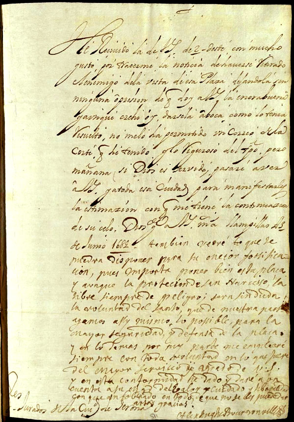 (Ampliar) - 3 de juny de 1684. El lloctinent Alexandre de Bournonville, duc de Bournonville, als jurats de la ciutat de Girona. Els comunica la seva satisfacció per la retirada de les tropes franceses i els fa saber també que demà anirà a Girona per donar-los l’enhorabona. D’altra banda, els diu que disposarà la manera millor per a la fortificació de la ciutat. Lletres Reials. Ajuntament de Girona.