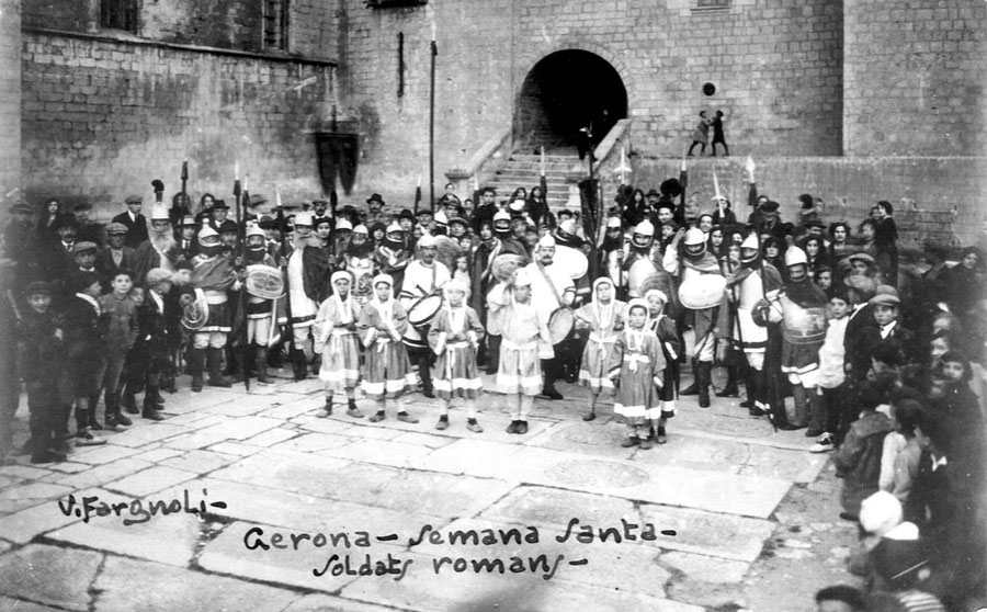 ![]() AntecedentsLa primera dada documental sobre l'existència dels Manaies a Girona és de l'any 1751, malgrat que alguns treballs reculen aquesta data a 1723. De fet, a la segona meitat del segle XVII es generalitzaven arreu de Catalunya els grups de manaies i armats. Segons l'historiador Ramon N. Comas i el folklorista Valerià Serra i Boldú, els manaies i armats, aparegueren a les processons de Setmana Santa quan el pare Epifià Cedó, de l'Ordre de Servitas, cap al 1663 va establir, al seu convent de Nostra Senyora del Bon Succés de Barcelona, la Confraria de Nostra Senyora dels Dolors. ![]()