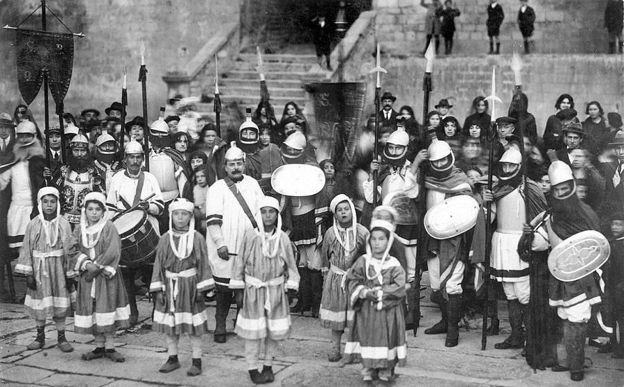 Els Manaies, en aquest període inicial dels segles XVIII-XIX, no formaven part d'una confraria exclusiva, a diferència del moment actual en el que estàn incorporats, com secció a part, dins la Confraria de Jesús Crucificat. El seu nombre oscil·lava entre la vintena i la quarantena. Vestien cuirassa i casc amb cimera, una capa, vermella per la processó del Dijous i blava per la del Divendres sants i, a més, llargs mostatxos i impressionants barbes postisses, negres, grises o blanques, per amagar la seva identitat. Anaven armats amb escut, espasa i llança. Colpejaven a terra amb la llança, característica que, de fet, s'ha mantingut fins avui, i probablement realitzaven ja la tradicional figura de l'estrella. ![]()