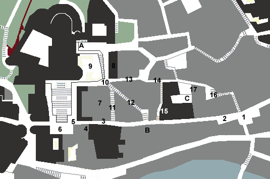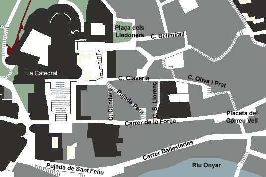 Mapes de referències actuals i històriques.1.- Portal o Castell de Requesens. Davant seu, la Placeta del Correu Vell. Anteriorment s'havia anomenat Castell de Cabrera, nom posterior al de Castell de Girona. Aquest portal va servir fins al segle XIX de presó, des de la qual es construí un arc que arribava fins a l'altre costat de la muralla vella, al carrer Ballesteries, damunt del qual, en un petit oratori, es venerava la imatge de Nostra Senyora de la Misericòrdia, i més tard sota l'advocació de Nostra Senyora de la Bona Mort, per relació als condemnats a la pena capital. 2.- Carrer de Sant Llorenç de la Força Vella. Quan va caure en desús la fira i festa de Sant Llorenç que celebrava aquest carrer cada any el dia 10 d'agost, començà a anomenar-se simplement carrer de la Força, nom amb el que és conegut actualment. 3.- Carrer anomenat indistintament del Mercadell i del Call jueu. Actualment és la part septentrional del carrer de la Força. 4.- Placeta de l'Institut Vell, actual Museu d'Història de la Ciutat de Girona. Al fons, la Canonja Vella, edificada sobre habitatges jueus, conserva restes d'un passatge paral·lel als carrers de la Força i de Ballesteries, i que abocaria a la plaça del Mercadell, indicada al gràfic amb el nombre 6. 5.- Portal del Mercadell. 6.- El Mercadell, l'antic mercat medieval, actualment plaça de la Catedral. 7.- Plaça del Mercat del Call jueu, dins l'actual edifici de la Pia Almoina, seu del Col·legi d'Arquitectes. 8.- Casa de l'Ardiaca Major. 9.- Actual plaça dels Apòstols. 10.- Portal de la Jueria. 11.- Carreró de l'Ardiaca, que en el segle XIX s'anomenava carrer d'en Bosqui i actualment correspon al carrer de Cúndaro. 12.- Pujada o Escales de la Mare de Déu de la Pera. 13.- Carrer de Claveria. 14.- Travessera del carrer de les Dones. Als anys cinquanta i seixanta se'n deia carrer de Cervantes, i actualment correspon al carrer del Dr. Miquel Oliva i Prats. Antigament s'havia anomenat Carrer de la Sinagoga. 15.- Carreró de la Sinagoga. Més tard se'n digué Carreró de Sant Llorenç, i al segle XIX Carreró d'en Berga. A la part alta s'hi troba la que havia estat casa de Lleó Avinay, un dels darrers regidors de l'Aljama gironina, actualment casa Colls-Labayen. 16.- Carrer de les Dones, més tard carrer de Cervantes i avui Miquel Oliva i Prats. Aquest carrer es va allargar fins a les escales que avui donen a l'inici del carrer de la Força, a la placeta del Correu Vell. 17.- Carreró d'Hernández, actualment tancat per edificaciones als dos extrems. A aquesta via dóna el mur sud de tencament de la casa Colls-Labayen i del centre Bonastruc Ça Porta. A.- Possible emplaçament de la primera Sinagoga de Girona. B.- Segona Sinagoga, tancada per la butlla del papa Luna l'any 1415, i reoberta posteriorment, tot i que el seu estat va aconsellar l'edificació d'una de nova. C.- Tercera Sinagoga, la darrera existent a Girona, venuda i abandonada en el moment de l'expulsió el 1492. |