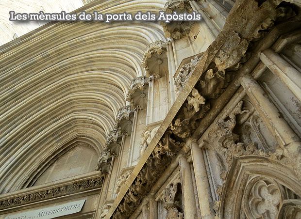La Porta dels Apòstols, que es troba a la façana sud de la catedral, va ser completada el 1975 segons el primitiu projecte atribuït a Guillem Morei (1366). Les mènsules, tot i no tenir un autor segur, probablement algunes varen ser treballades per Guillem Morell l'any 1381. D'altres, com la de l'àngel músic, que es troba repetit a la catedral de Tarragona, han fet suposar la intervenció a Girona del gran escultor quatrecentista Pere Johan. L'estructura, que està formada per la gradació d'arquivoltes apuntades, foren decorades amb les imatges dels dotze apòstols, de terracuita, i al seu timpà hi havia un relleu de l'Assumpció fet per Joan Claperós.