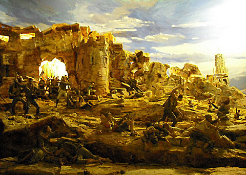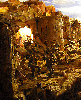 En un dels laterals de la sala es presenta un diorama de grans dimensions amb una escena de l'atac al portal i baluard de Sant Cristòfol durant els fets del 19 de setembre de 1809, l'anomenat Gran Dia de Girona. Aquest dia, des de primeres hores, les bateries franceses intensificaren encara més el seu bombardeix contra els esvorancs oberts a les muralles, el fort del Calvari i la torre Gironella, i la muralla de Santa Llúcia. El seu atac va eixamplar considerablement els dos esvorancs de dies anteriores a Alemanys, per on ja podien passar 40 soldats de front. A les quatre de la tarda, columnes escollides de tropes franceses sortiren del castell de Montjuïc i es dirigiren, una, a atacar el fort del Calvari, i les altres els esvorancs de la muralla d'Alemanys i de Santa Llúcia. Els atacs, que en successives onades arribaren al cos a cos, foren aturades pels defensors. ![]() Alguns atacants es reorganitzaren a redòs contra el foc que se'ls feia des de les muralles, la veïna torre Gironella i el baluard de Sarraïnes. Un escamot dels soldats assetjants aconseguí passar l'esvoranc d'Alemanys, i arribar fins el pati de la caserna i entrada a la plaça dels Lledoners; un destacament d'Ultònia apostat a la plaça dels Apòstols va aconseguir rebutjar-los del tot. ![]() El general Verdier va veure com el seu pla d'atac fracassava estabellant-se una i altra vegada contra les defenses de la ciutat. Ateses les dificultats que tenia la ciutat per obtenir queviures i altres materials, els napoleònics optaren més pel setge que per a noves escomeses. ![]() Fotografies preses per gentilesa del Museu d'Història de la Ciutat.
