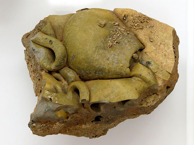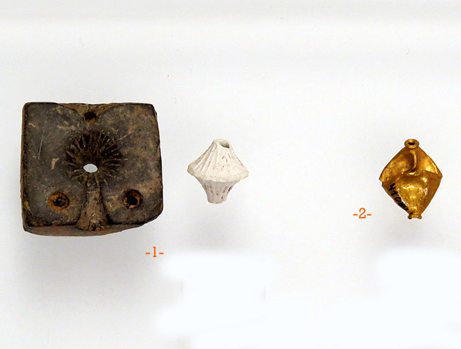 1. Motllo per fer denes i buidat de guix, pedra sorrenca, 400-350 aC. 2. Dena, or, feta en un motllo com l'anterior, Mas Castellar (Pontós, Alt Empordà). 400-350 aC. |