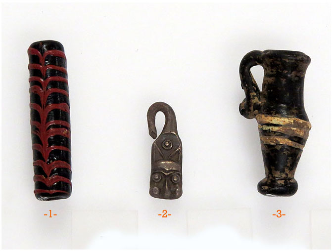1. Dena de collar, vidre, Rhode (Roses, Alt Empordà), 200-175 aC. 2. Penjoll, plata, Puig de Castellet (LLoret de Mar, La Selva), segona meitat segle III aC. 3. Penjoll en forma de gerret amb nansa, vidre. Rhode (Roses, Alt Empordà), segle III aC. |
