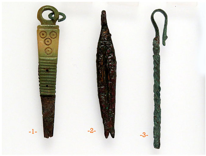 1, 2 i 3. Estris de tocador, scalptorium, amb decoració incisa, bronze i bronze i os, Mas Castellar (Pontós, Alt Empordà), 250-200 aC. |