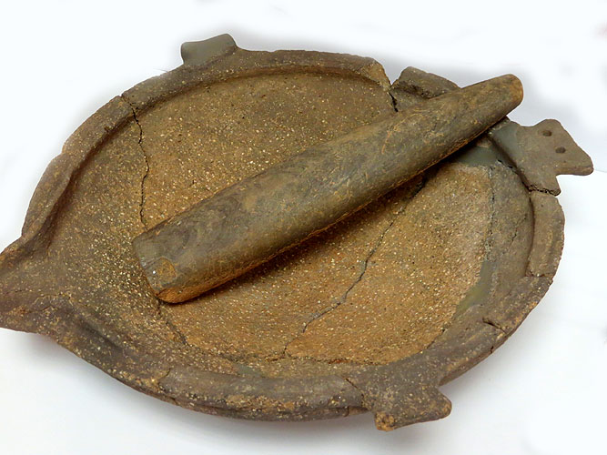 Morter, ceràmica;, i mà de morter, pedra, Mas Castellar (Pontós, Alt Empordà), segle III aC. |