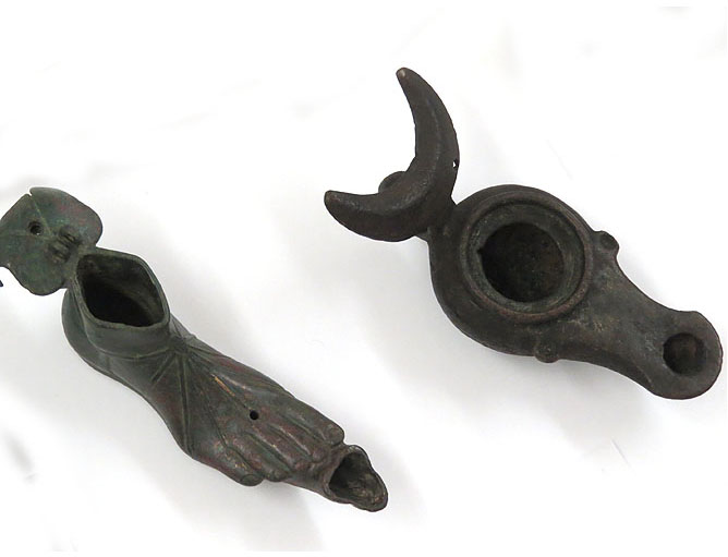 Esquerra: llàntia en forma de peu amb sandàlia, bronze, segles I-III dC. Dreta: llàntia amb bec de volutes, bronze. Domeny (Sant Gregori, Gironès). Segles I-II dC. |